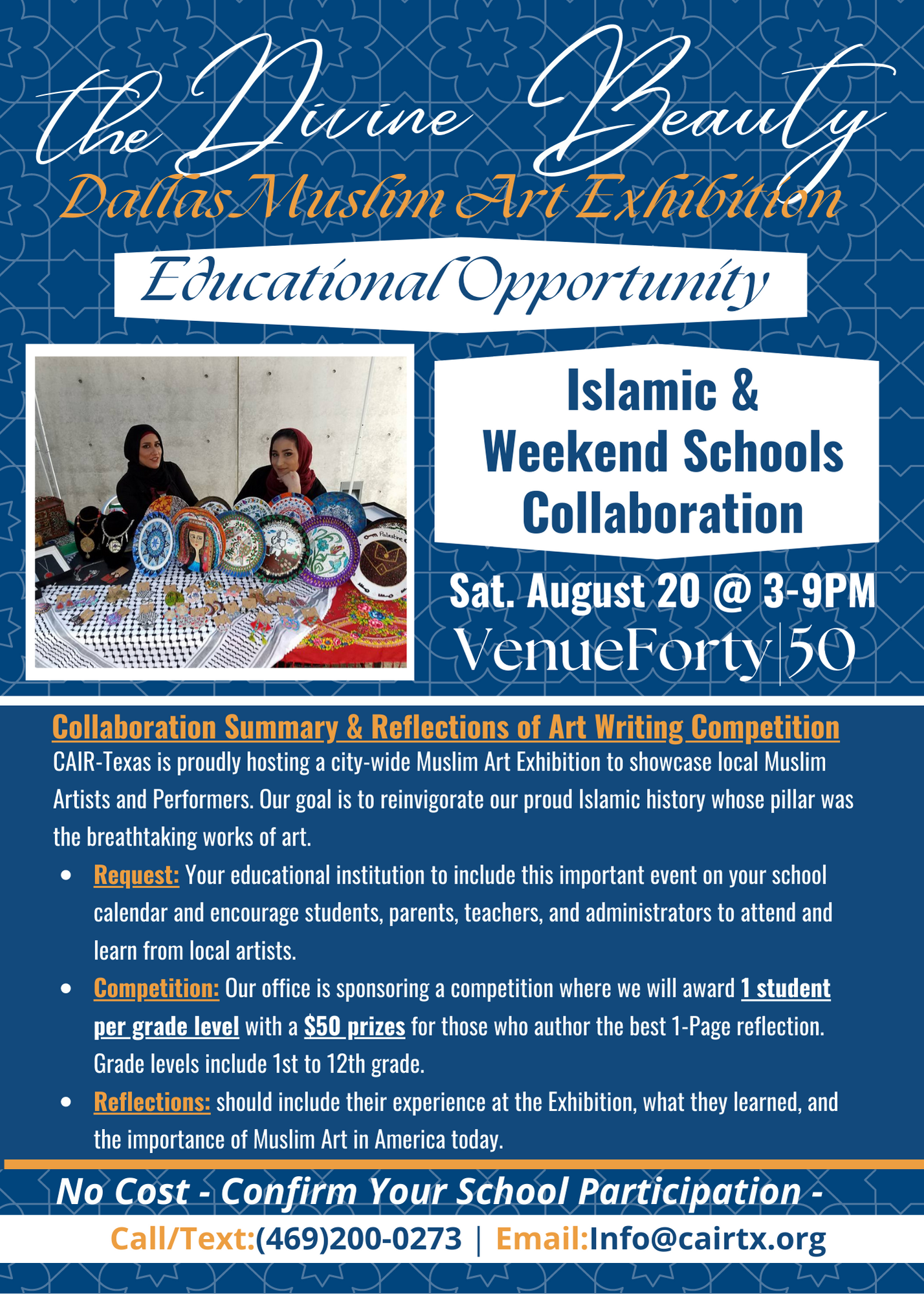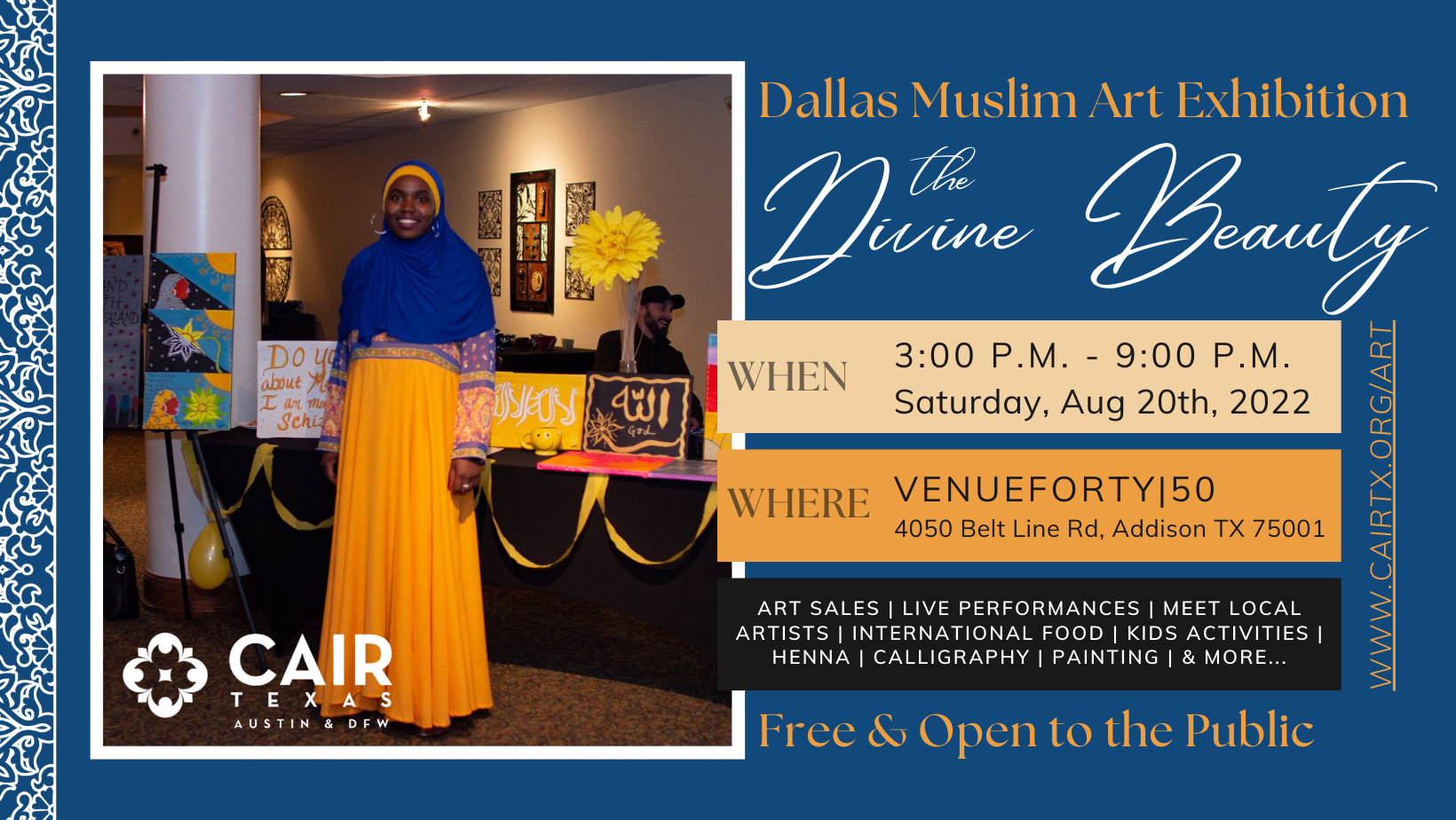 Join us for our 1st "The Divine Beauty" Dallas Muslim Art Exhibition hosted by CAIR-Texas Austin & DFW. Muslims are one of the most ethnically and culturally diverse communities in America, and that diversity can best be seen through their unique artistic masterpieces, poetry, and craftsmanship.