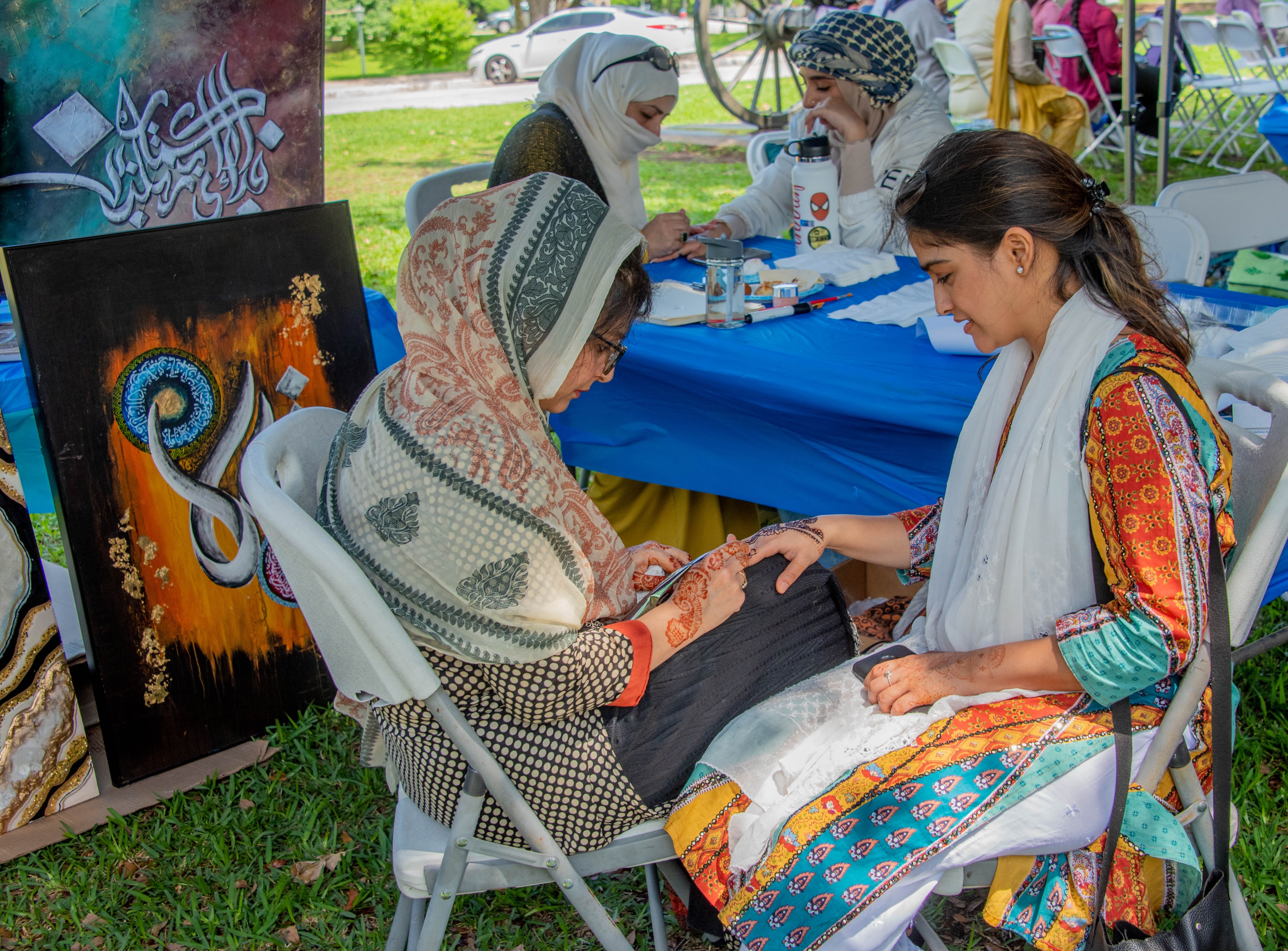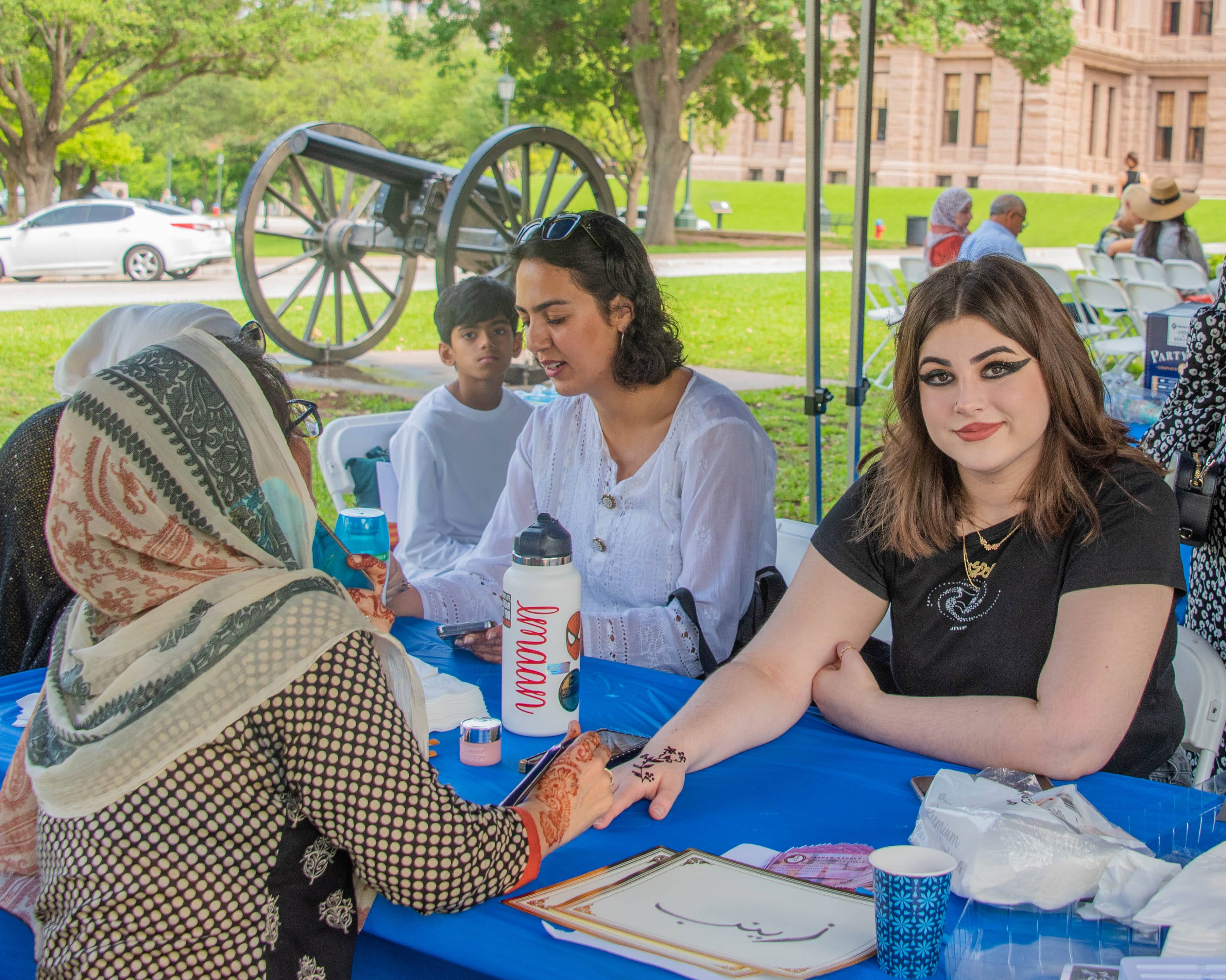This first year of the Austin Eid Celebration was truly a community-driven event, with support from several of the area's largest mosques and community centers. In addition to supplies provided by the Islamic Center of Brushy Creek (ICBC), almost two dozen members of the local Muslim community volunteered to assist in serving the food and managing the celebration's other activities, such as henna art, face painting, and personalized Arabic calligraphy. Students from the University of Texas MSA (Muslim Student Association) also helped manage the event, and engaged in fruitful dialogue with visitors that were attracted to the Islamic informational brochures and translations of the Qur'an available for free at the event's Dawa table.